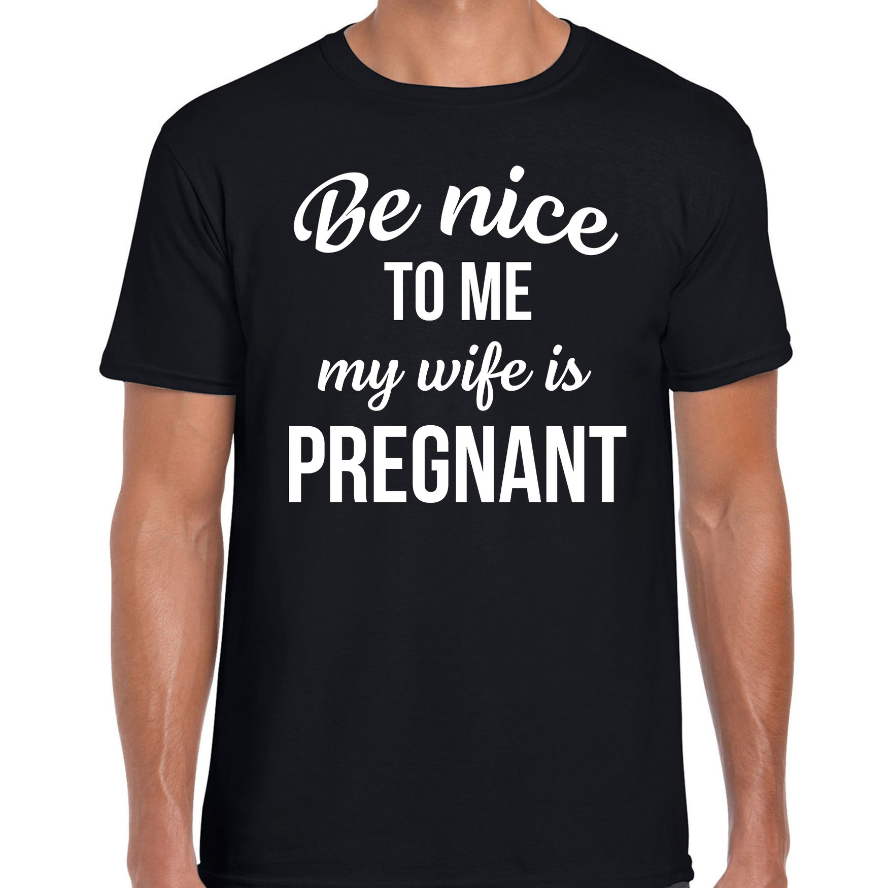 Be nice to me my wife is pregnant cadeau t-shirt zwart voor heren. Op dit zwarte shirt staat groot de tekst: Be nice to me my wife is pregnant.