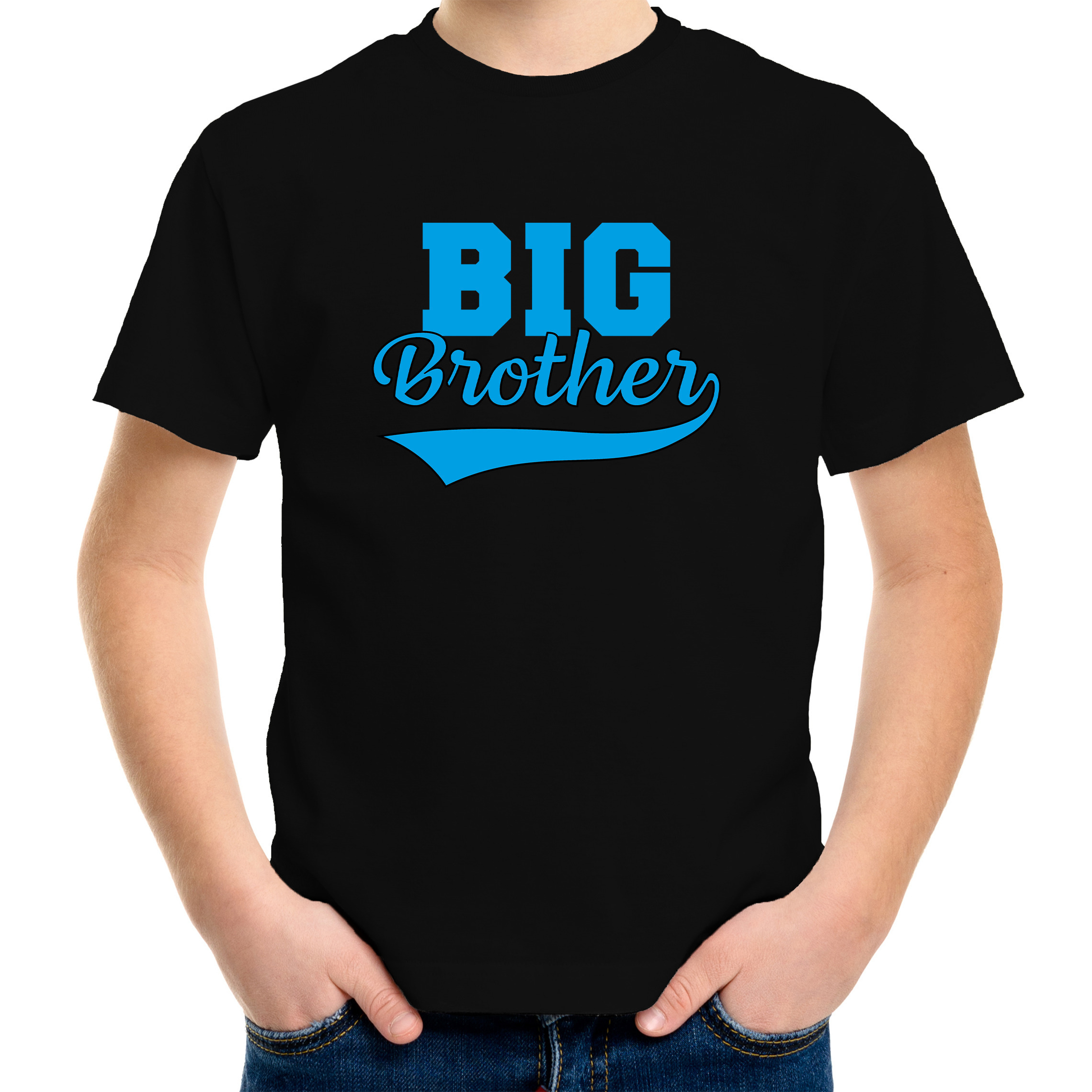 Big brother cadeau t-shirt zwart voor jongens / kinderen. Op dit zwarte kado shirt staat in grote blauwe letters de tekst: Big brother. Leuk t-shirt voor bijvoorbeeld bij de aankondiging van een toekomstig broertje of zusje.