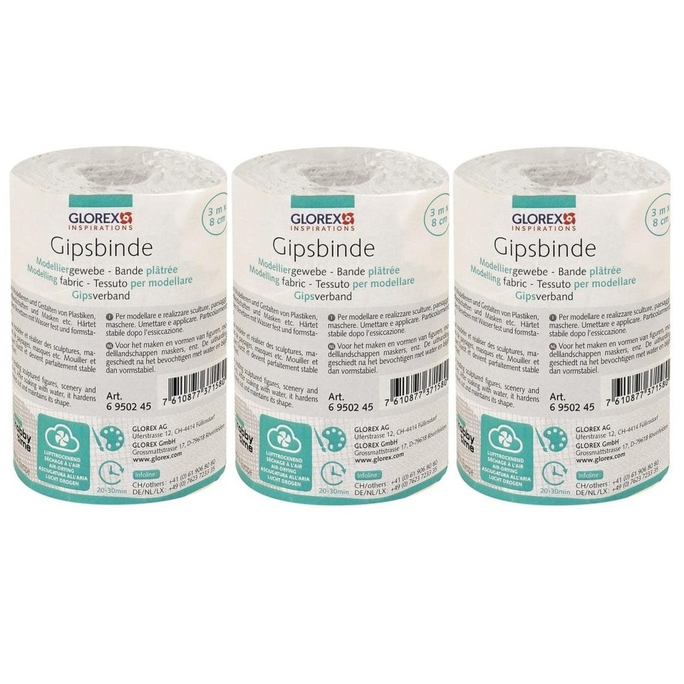 3 rollen een rol huidvriendelijk gipsverband met een lengte van 3 meter. De hoogte is ca. 8 cm. Het verband is bijvoorbeeld zeer geschikt om een afdruk van een zwangere buik te maken!