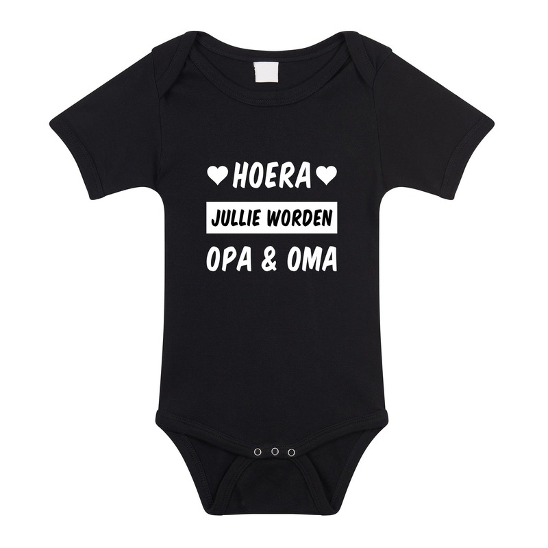Hoera jullie worden opa en oma kado tekst baby rompertje zwart voor meisjes en jongens. Op dit zwarte rompertje staat de tekst: Hoera jullie worden opa en oma! Leuk kado idee voor toekomstige opa en oma, bijvoorbeeld bij de aankondiging van een zwangerschap. Dit cadeau rompertje heeft 3 nikkelvrije drukkertjes aan de onderkant. Materiaal: 240 grams, 100% katoen.