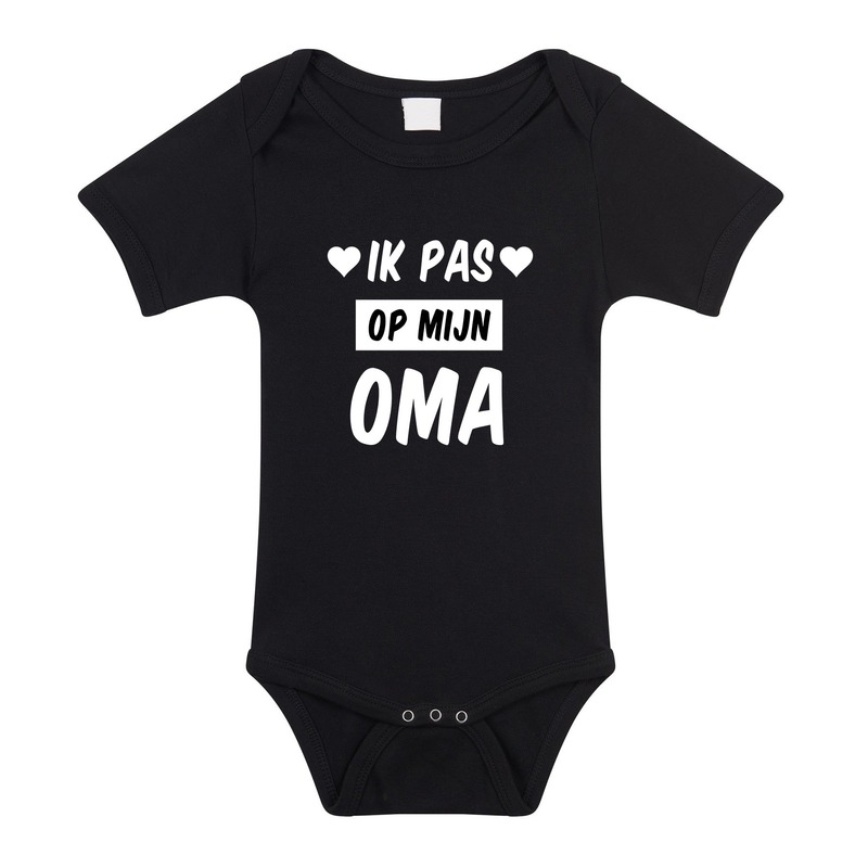 Ik pas op mijn oma kado tekst baby rompertje zwart voor meisjes en jongens. Op dit zwart rompertje staat de tekst: Ik pas op mijn oma! Leuk kado idee om bijvoorbeeld aan te trekken als de baby bij oma gaat logeren of als kraamcadeautje van oma. Dit cadeau rompertje heeft 3 nikkelvrije drukkertjes aan de onderkant. Materiaal: 240 grams, 100% katoen.