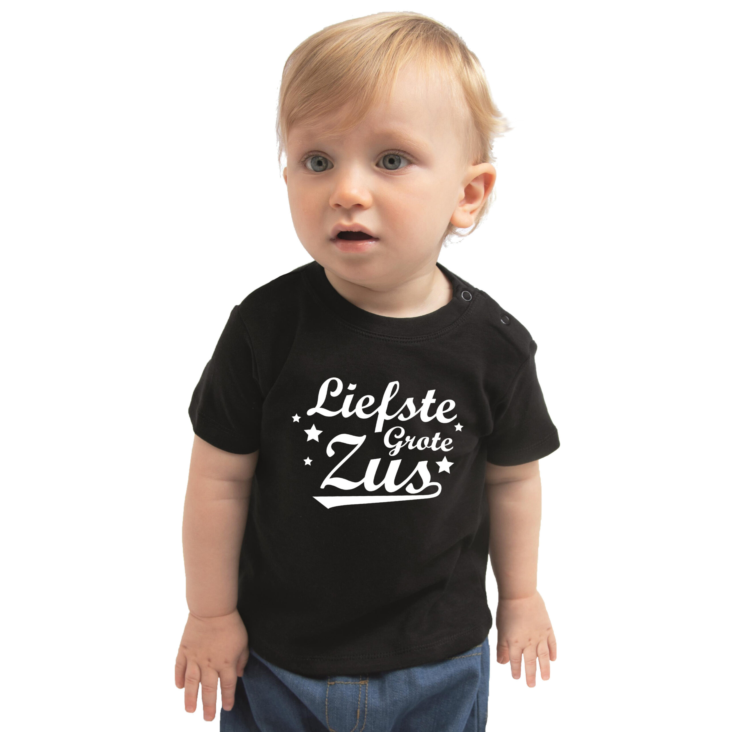 Liefste grote zus cadeau t-shirt zwart voor babys / meisjes. Op dit zwarte kado shirt staat in witte letters met sterretjes de tekst: Liefste grote zus. Leuk t-shirt voor bijvoorbeeld bij de aankondiging van een toekomstig broertje of zusje.