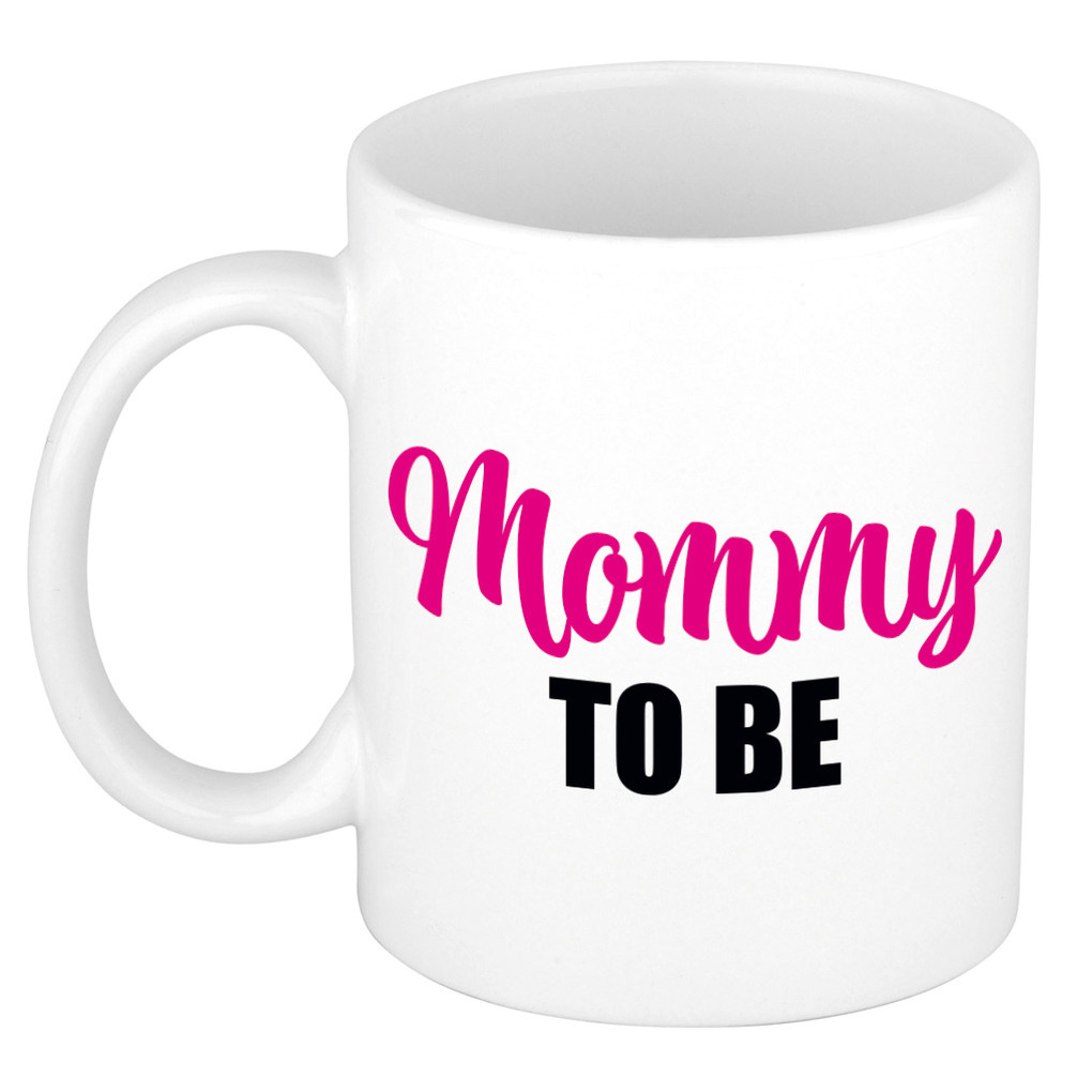 Mommy to be cadeau mok / beker wit, 300 ml. Deze mok/ beker is bedrukt in roze / zwarte letters met de tekst: Mommy to be.