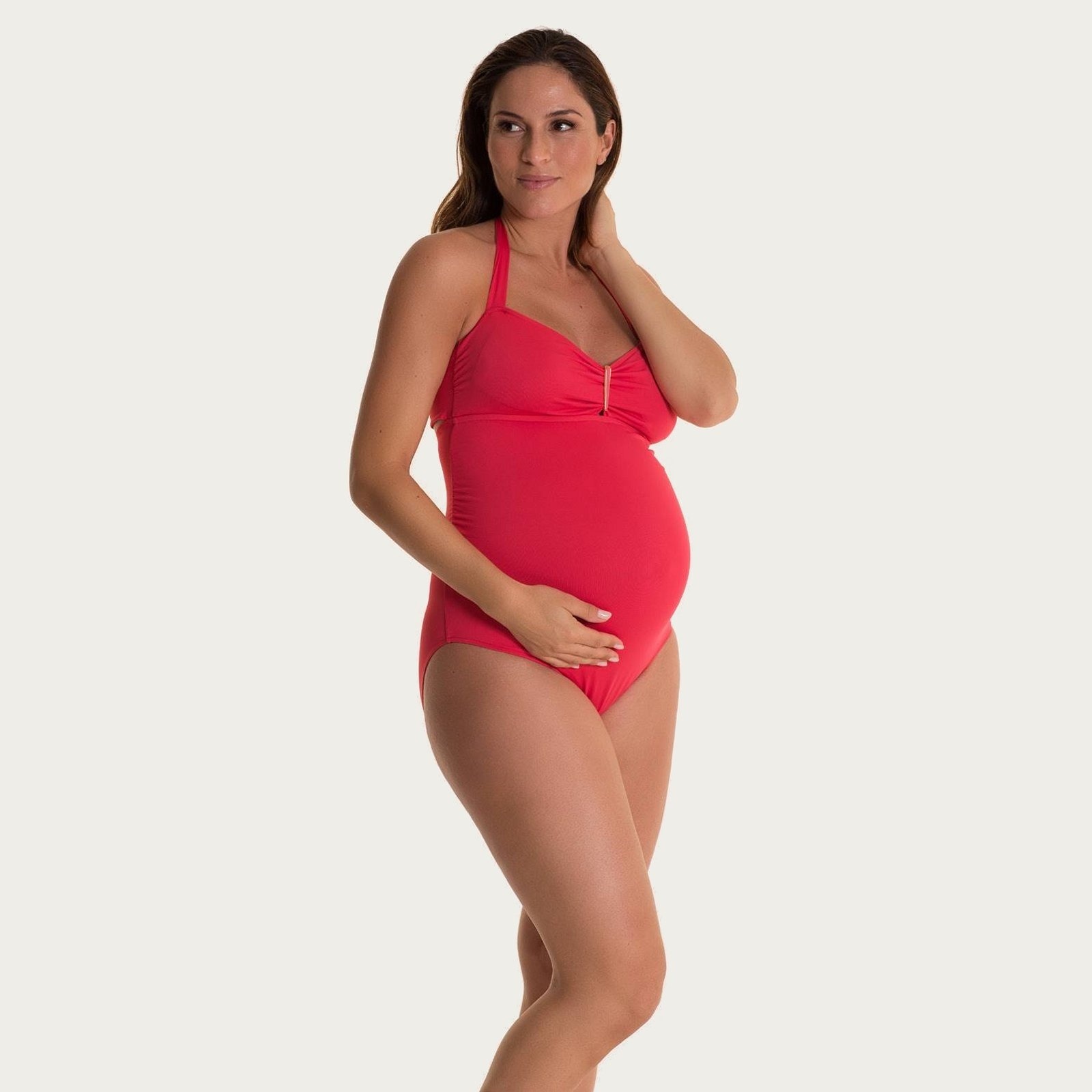 Heel opvallend mooi rood Zwangerschapsbadpak Helena. Tussen de borsten zit een mooi pin wat een extra sjieke uitstraling geeft. Mooi zwanger langs het strand in dit badpak.