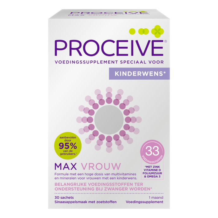 Proceive Kinderwens Max Vrouw Capsules (30 stuks) is een voedingssupplement speciaal ontwikkeld voor vrouwen. Het bevat 33 voedingsstoffen, waaronder vitaminen, mineralen en aminozuren. Alle ingrediënten worden geleverd op de optimale sterkte in een zeer absorbeerbare vorm.